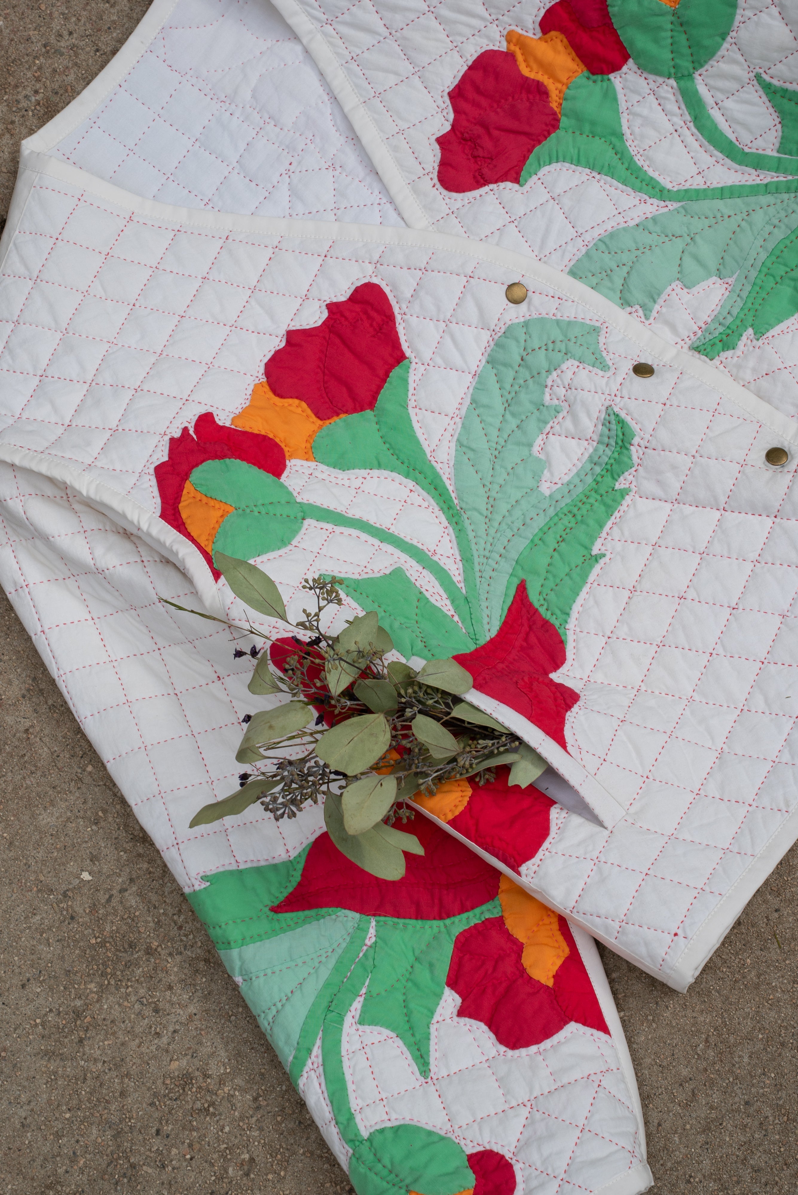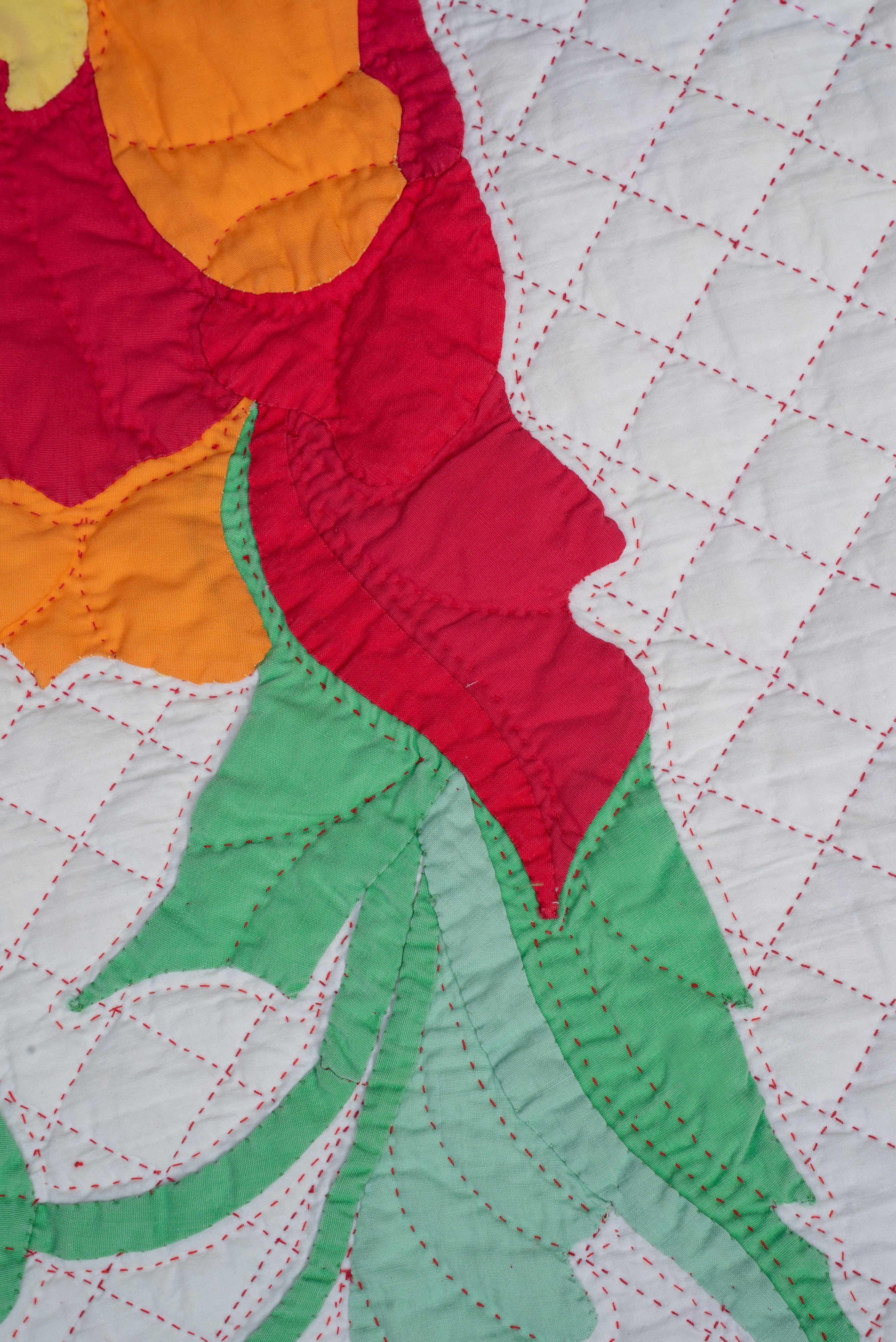 This quilted piece features large applique florals in shades of pinky reds, tangerine orange, yellow, and mint greens. Small bright red stitchwork is in a grid pattern throughout. White binding encases all seamwork. I can cut just one in any size, please expect your piece to ship 12 days from your order as I will sew your piece in your size of choice.