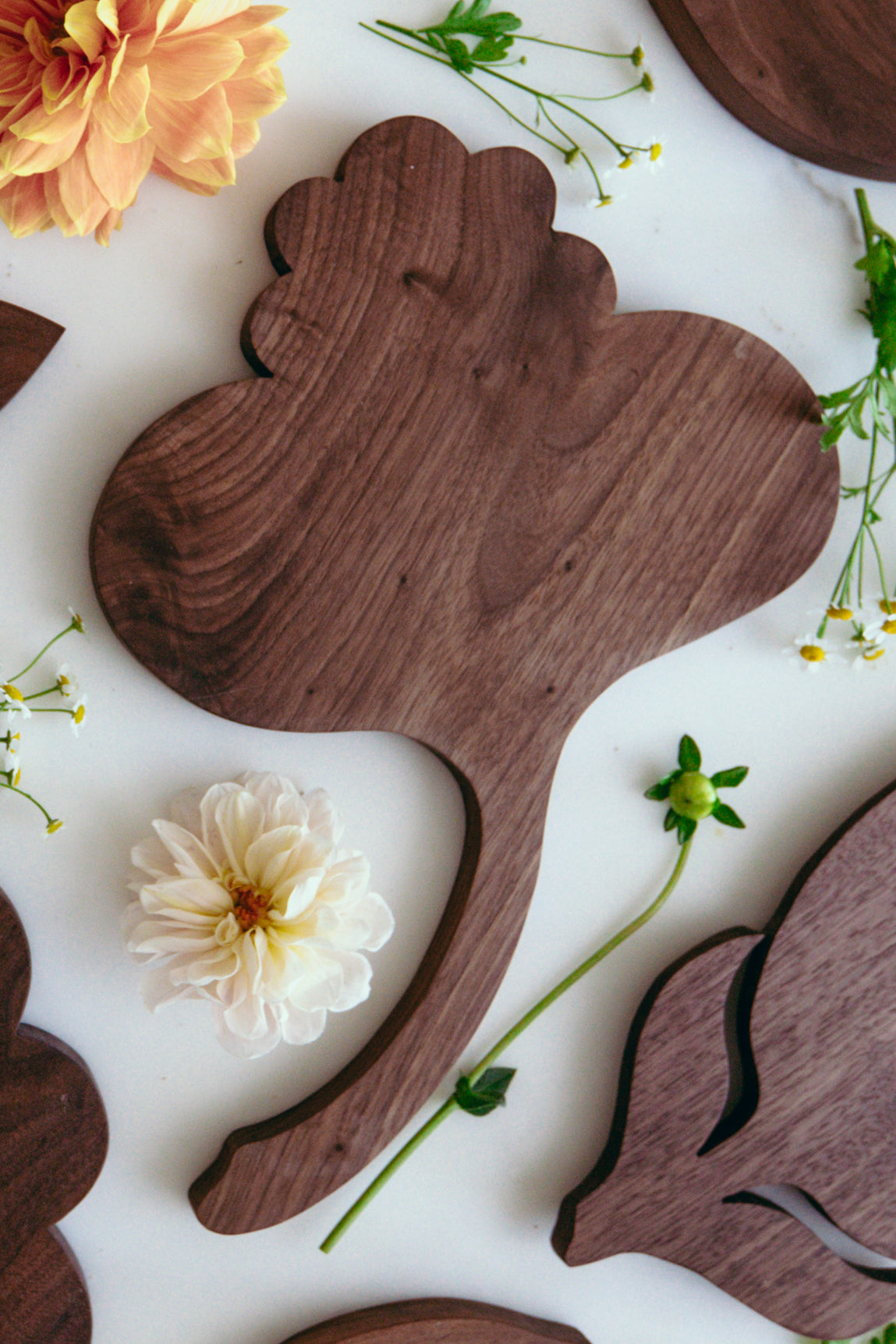 Please meet our original Dahlia Board. This walnut board is carved here in our Los Angeles studio. Finished with Beeswax and mineral oil, this board is smooth to the touch, food safe and is ready to use as a cheeseboard, serving platter, or a special piece to hang in your home.