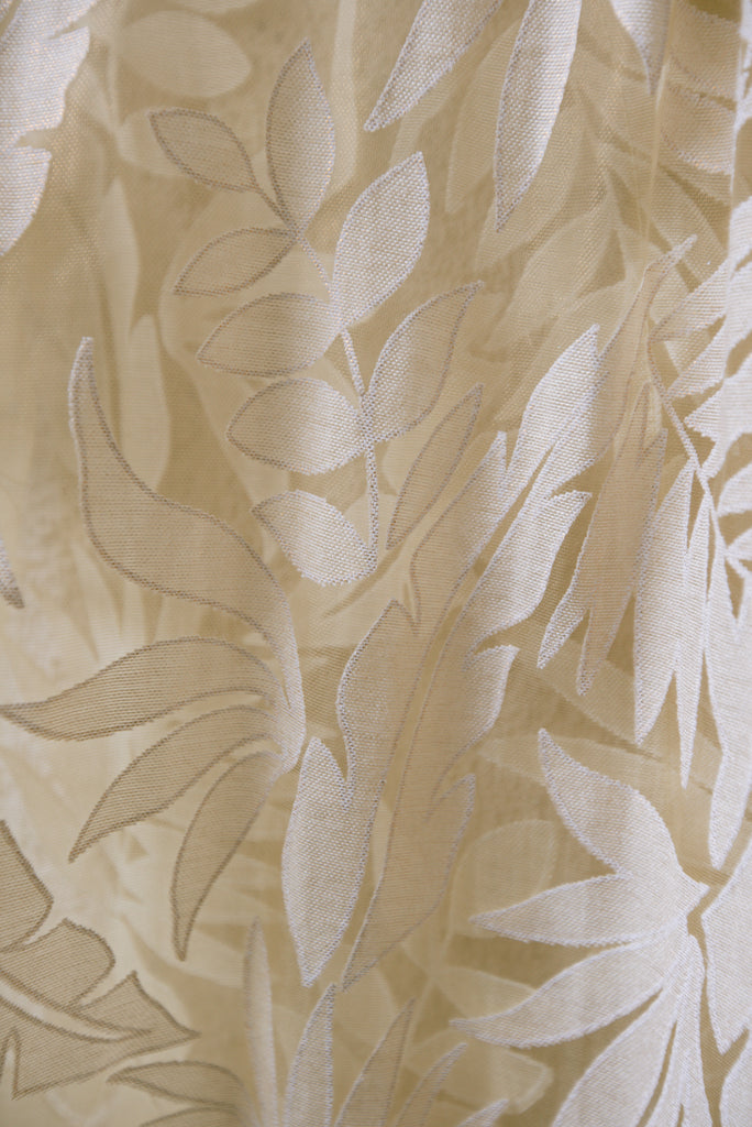 A deadstock sheer organza textile featuring a woven gold leaf pattern and shell buttons down center front.