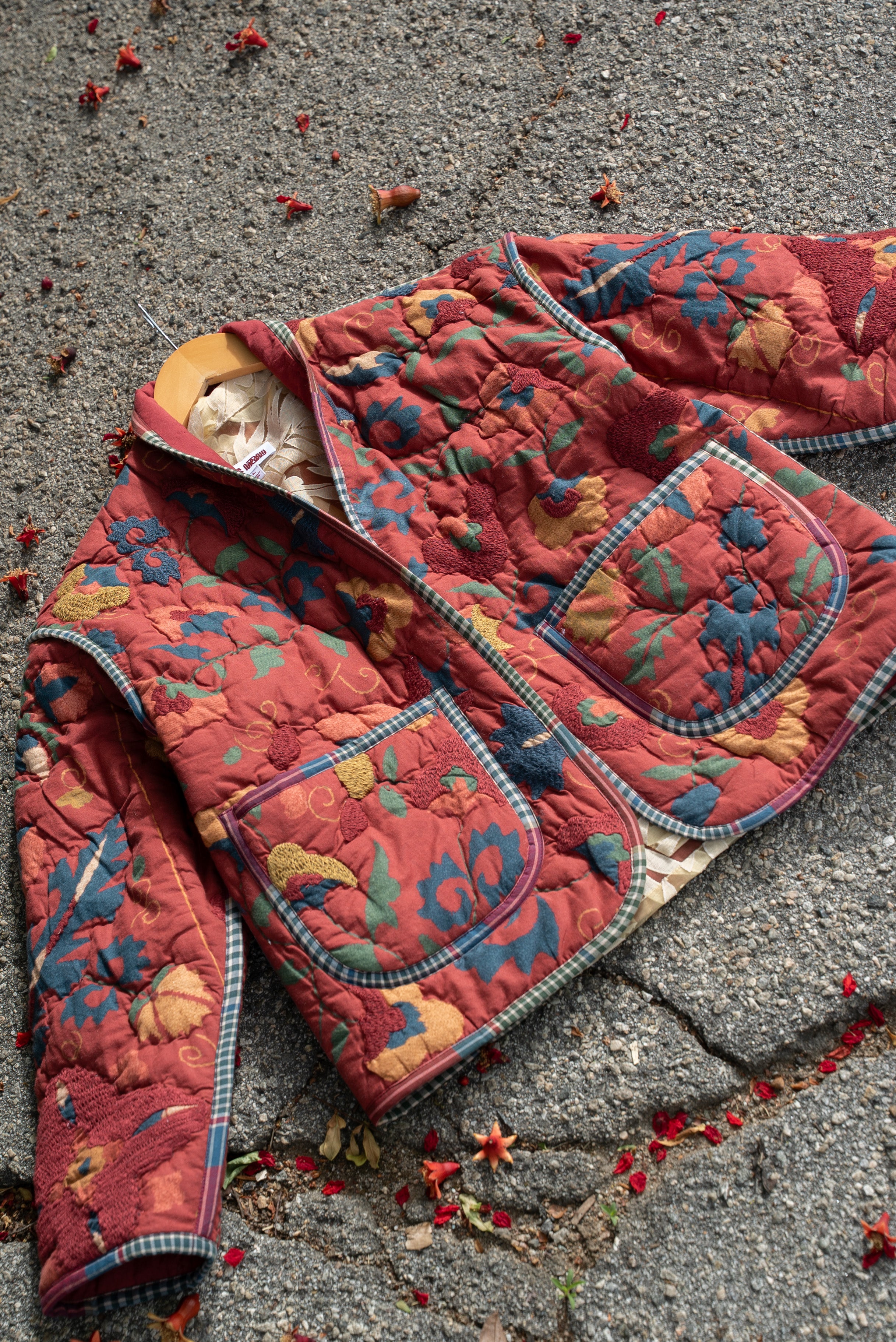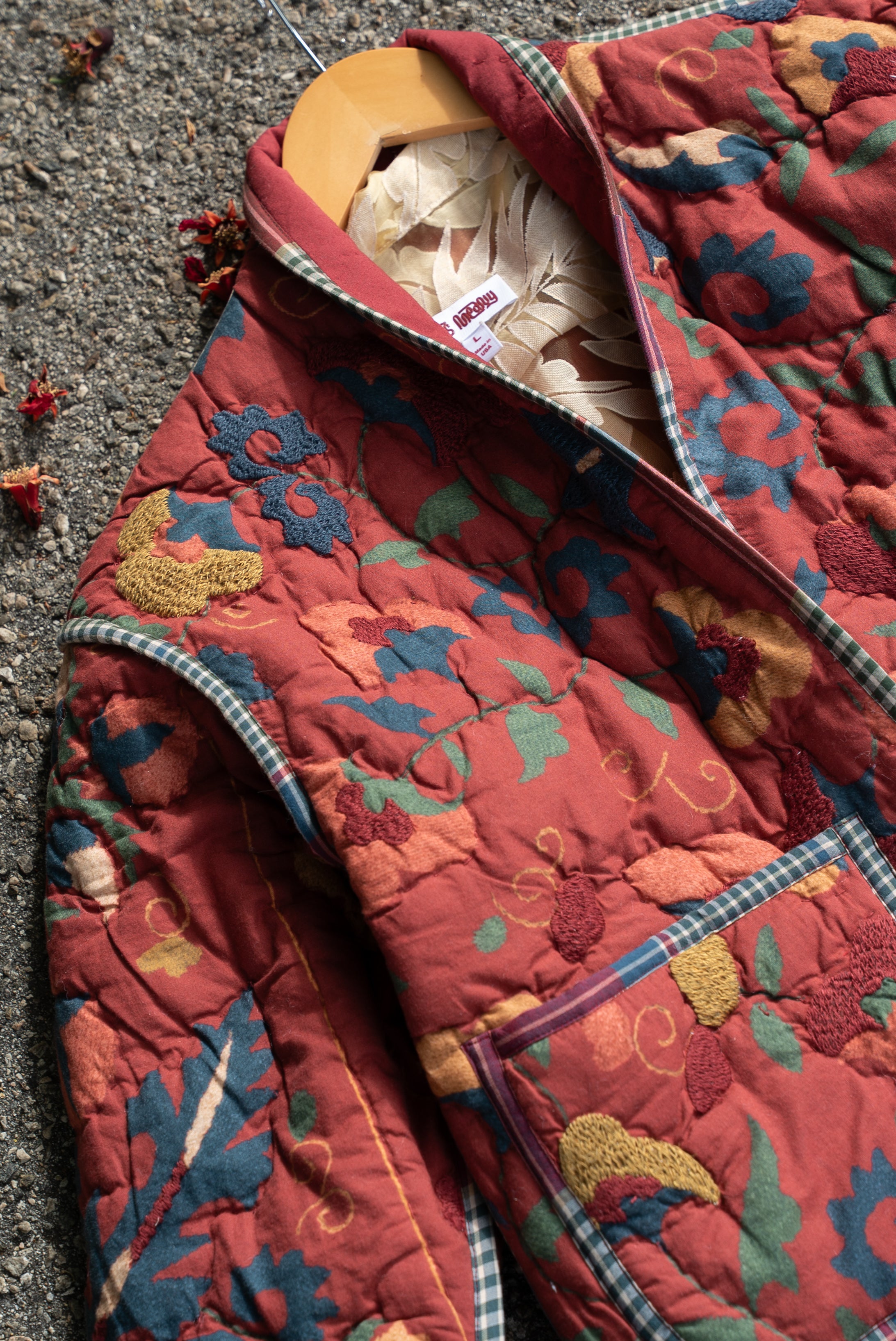 Soft cotton in deep red shades of a spring blooming dahlia. Featuring touches of embroidery in shades of blue, yolk, and brick. Bound with handcut deadstock plaid binding, that we tea stain in-house to match this cozy quilting. :)