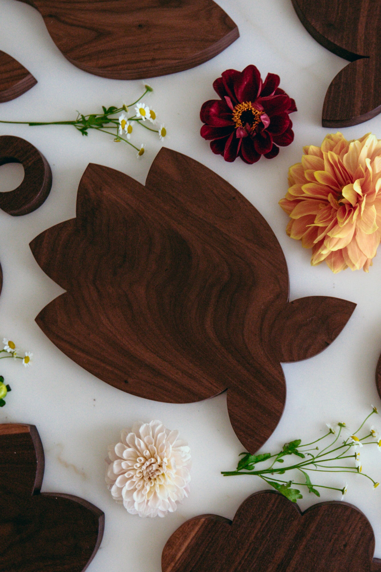 Please meet our original Tulip Board. This walnut board is carved here in our Los Angeles studio. Finished with Beeswax and mineral oil, this board is smooth to the touch, food safe and is ready to use as a cheeseboard, serving platter, or a special piece to hang in your home.